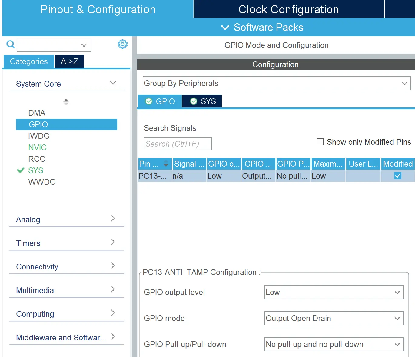 - 在 「GPIO」 页面下,选择对应引脚,将 「GPIO mode」 设置为 「Output Open Drain」