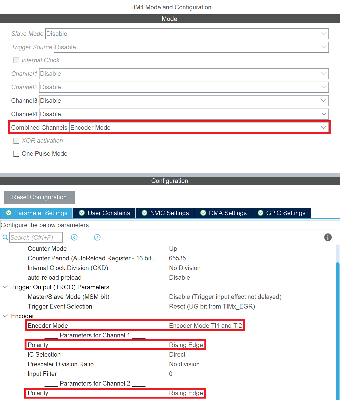 - 在 TI1 和 TI2 改变时均计数(4 倍频):Encoder Mode TI1 and TI2