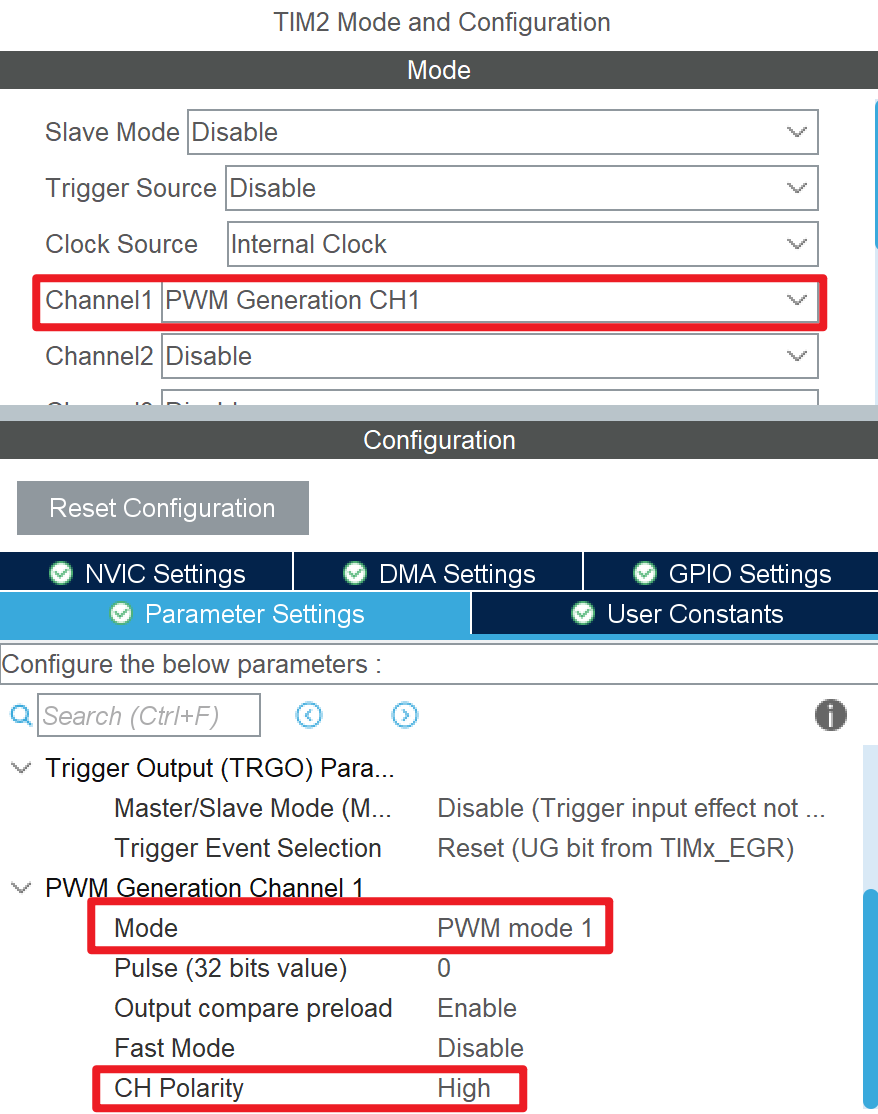 PSC、自动重装载值ARR等),参见 基本用法。 - 在⌈通道配置⌋中,选择⌈PWM Generation CHx⌋,并设置⌈PWM 模式⌋、⌈通道极性(CH Polarity)⌋等参数。