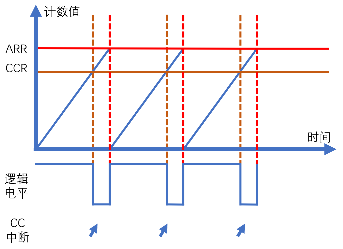 此外,在计数值 CNT 递增到与比较值 CCRx 相等时,会触发⌈捕获/比较(CC)⌋中断。如果比较值 CCRx 大于 ARR,则会在发生重装载(Update)时触发⌈捕获/比较(CC)⌋中断。