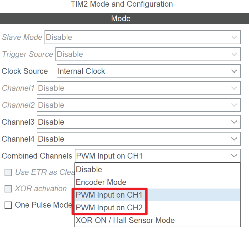 • 设置 Combined ChannelsPWM Input on CHx,其中 x 决定了信号输入通道以及引脚